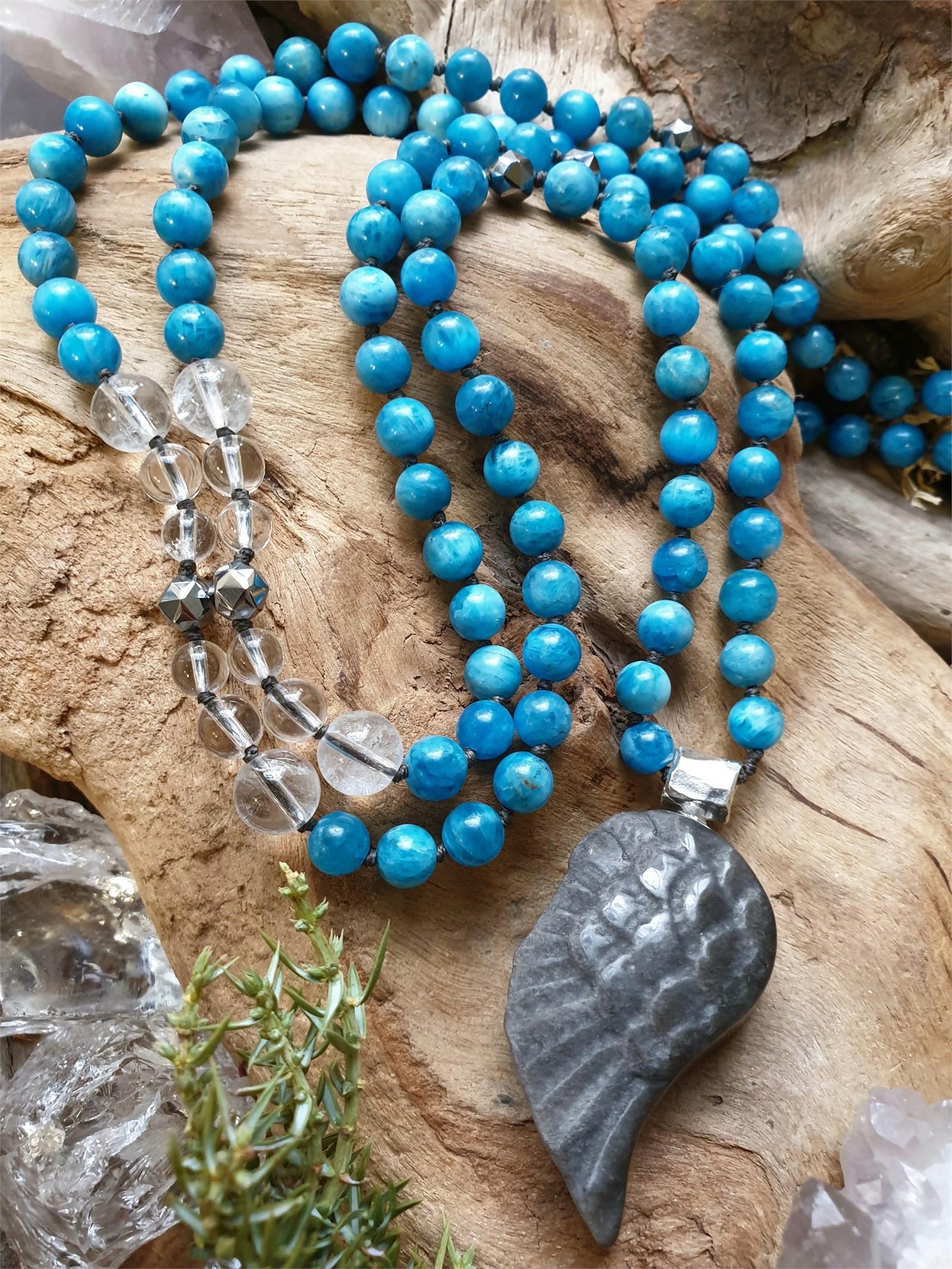 Крыло из обсидиана на бусах из апатита, горного хрусталя, терагерца